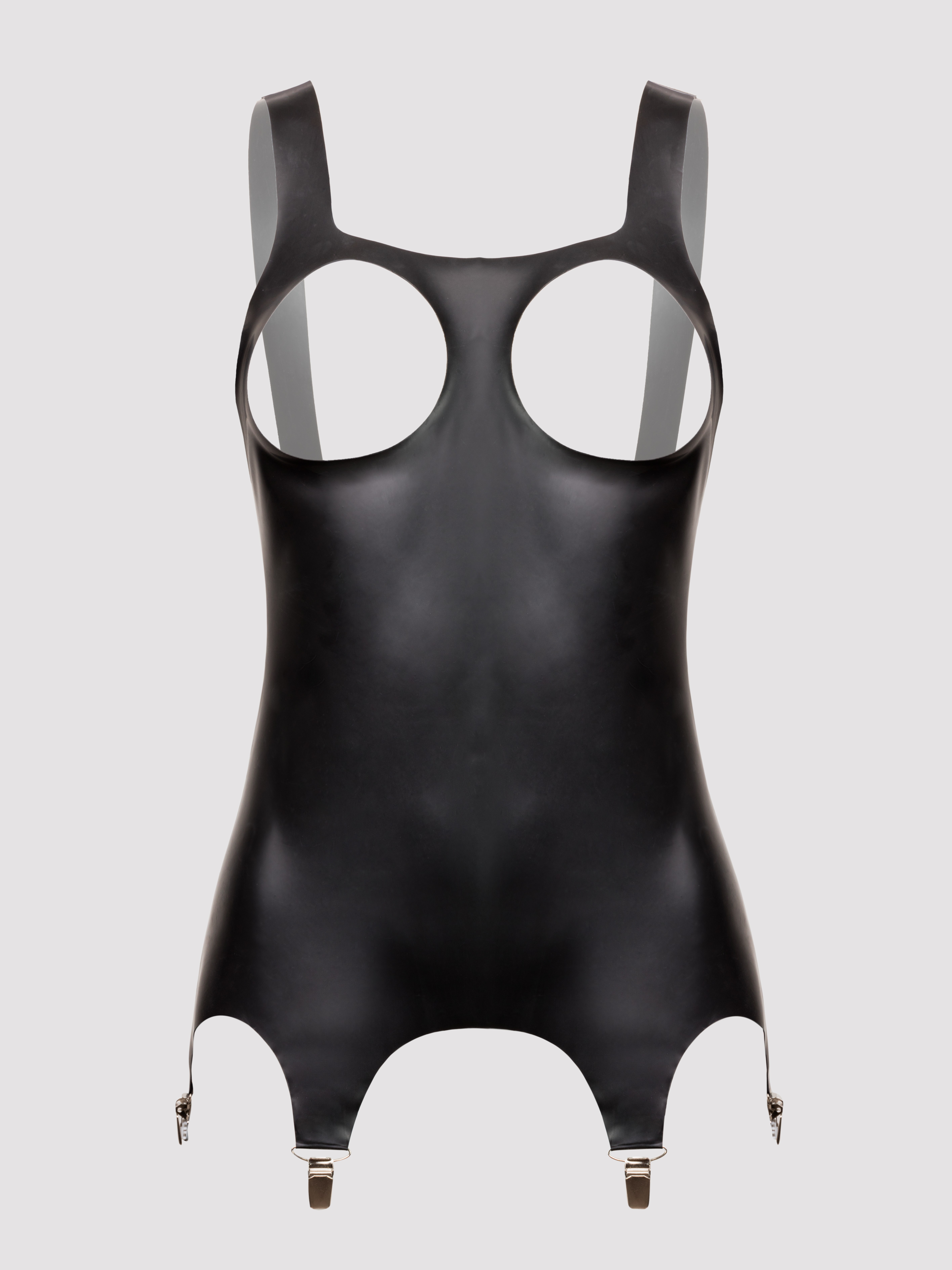 Get those headlights on at full beam with this sexy fetish-inspired, latex open-cup basque with suspenders. Moulding to your curves in all the right places, this skintight beauty features two cut-out holes for your breasts to shine through.