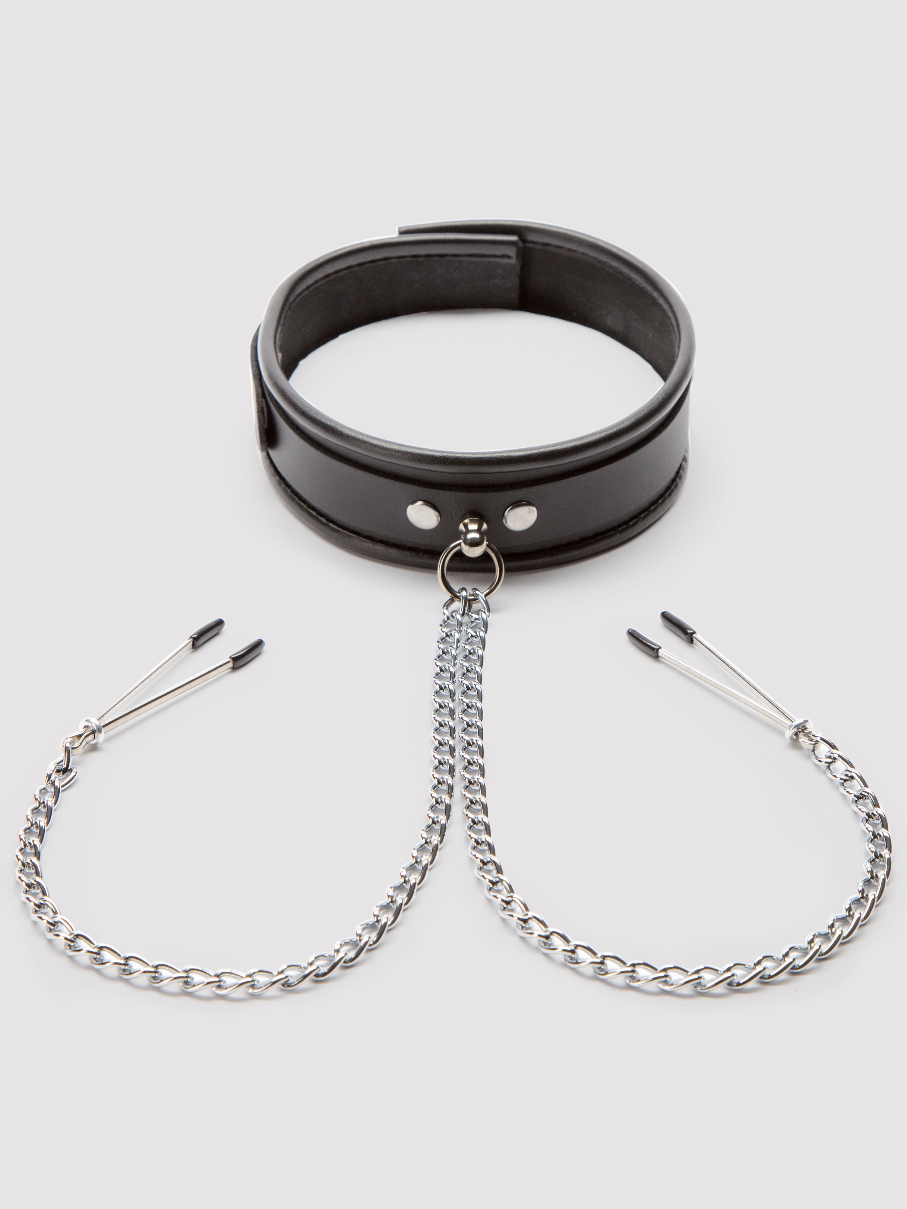 - Leather collar with adjustable tweezer-style clamps on chains for sensational nipple stimulation