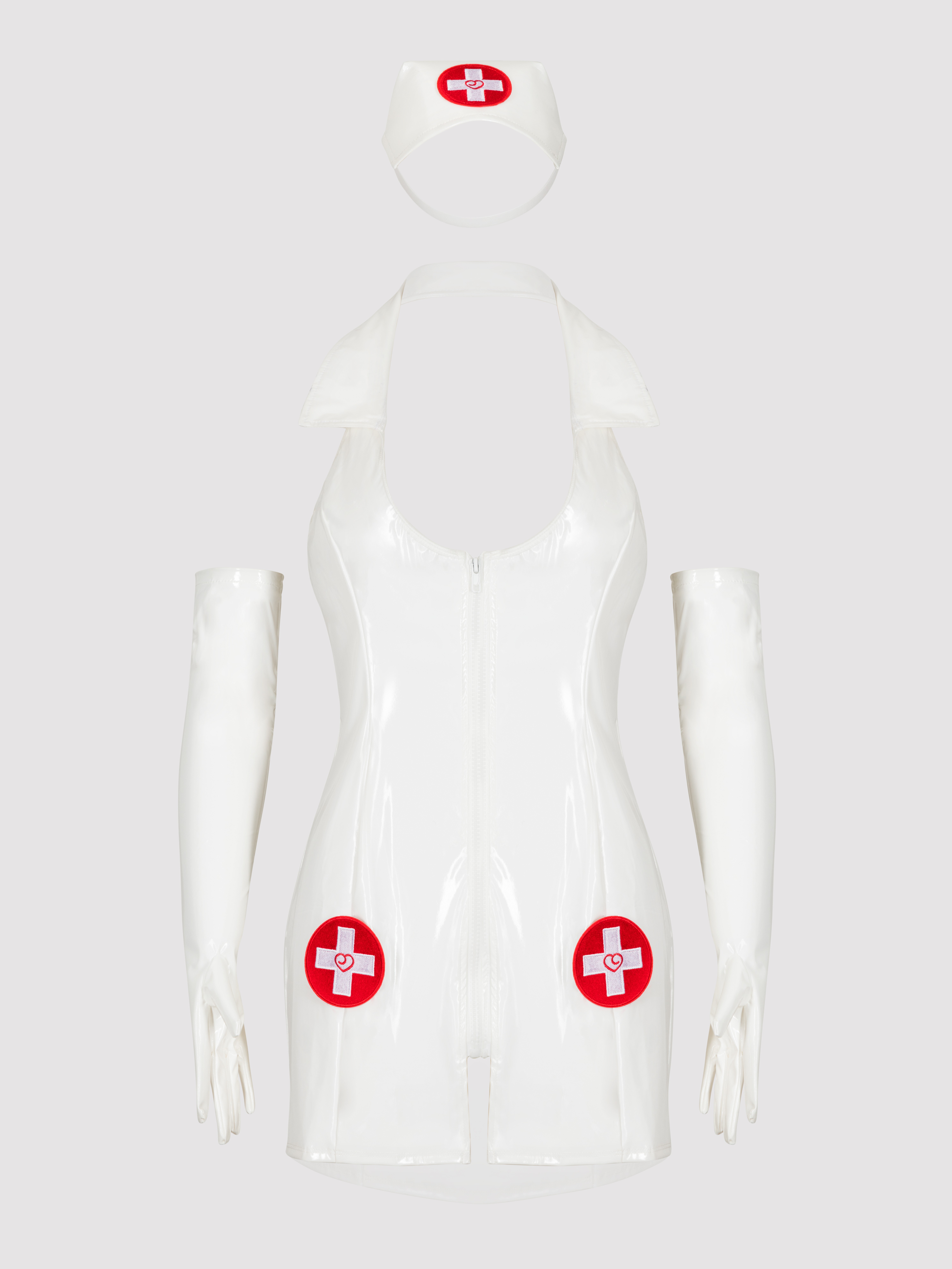 Get those healing hands ready and send temperatures soaring and pulses racing in this curve-hugging PVC-look nurse costume. With its elbow-length gloves, tantalising front zip and matching hat, this set should definitely come with a health warning.
