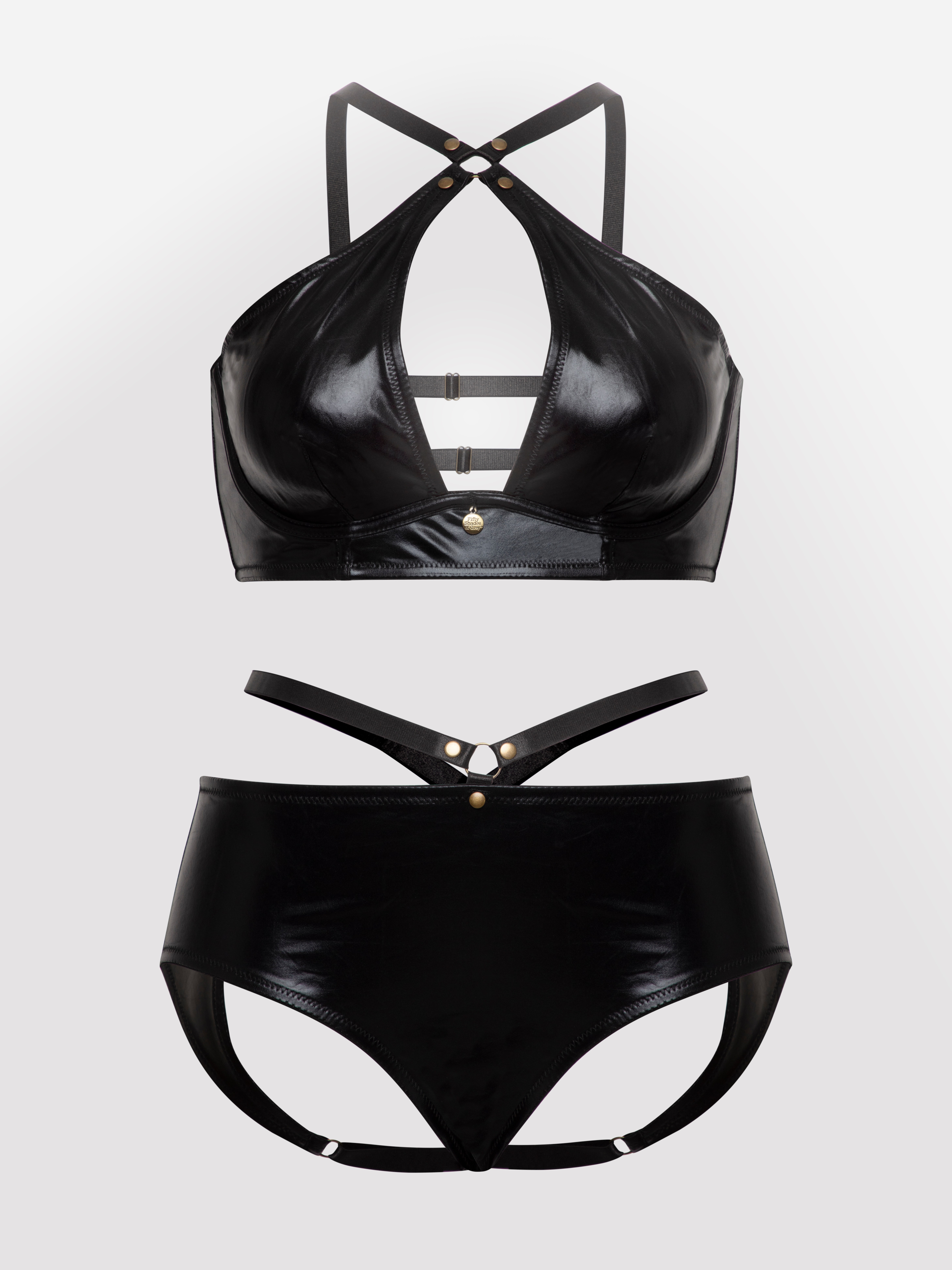 Absolutely dripping in sex appeal, this is not your average bra set. Irresistibly sleek and tactile wet look fabric works its magic on your curves, with straps adding fetish-style allure to the plunging halterneck bra and crotchless spanking knickers.