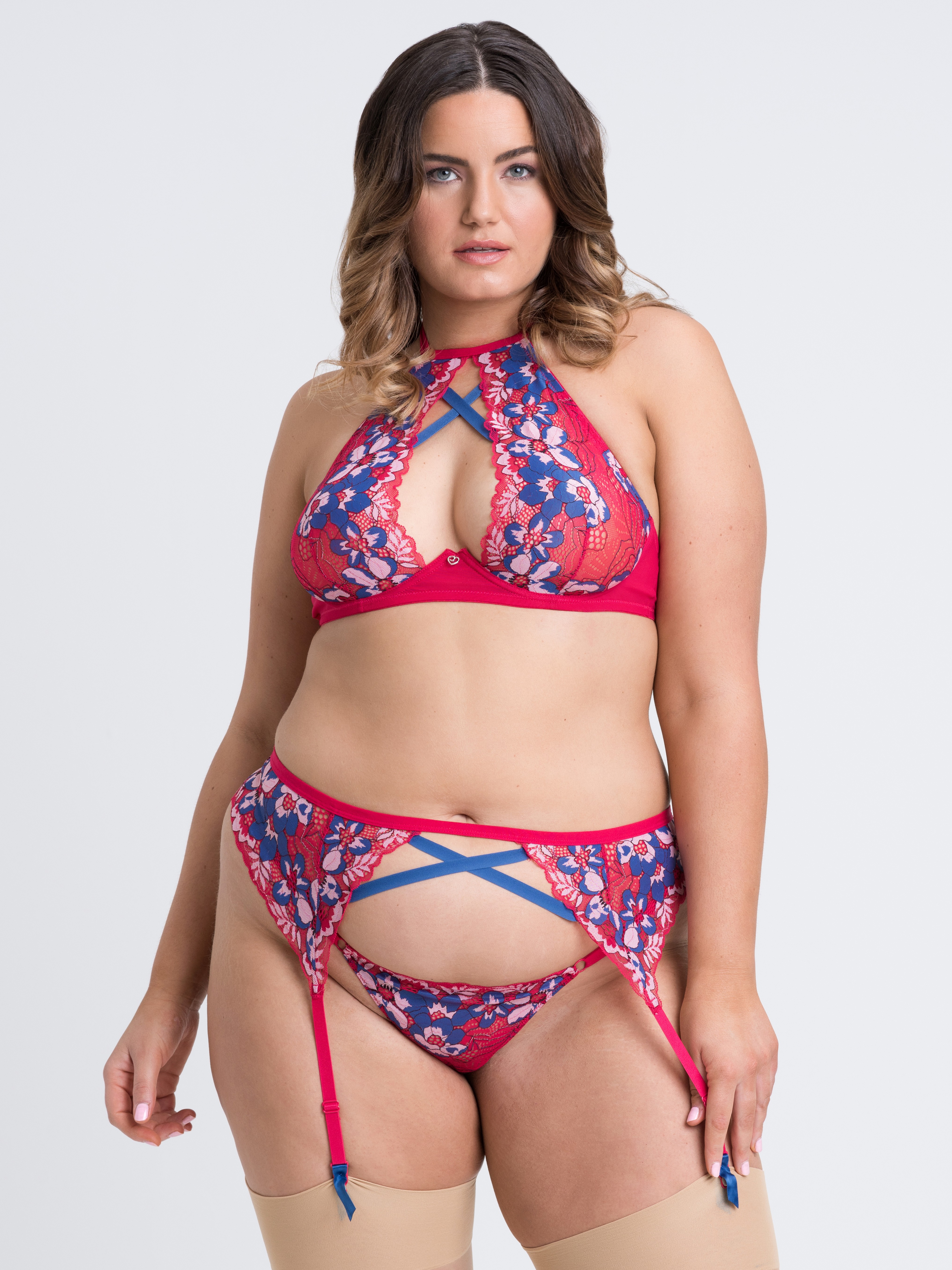 Made from sheer scarlet fabric with blue and pink accents, this floral set brings a pop of colour to your lingerie collection. The floral lace detailing is elegant, while the plunging keyhole neckline and butt-baring thong keep your look super sexy.