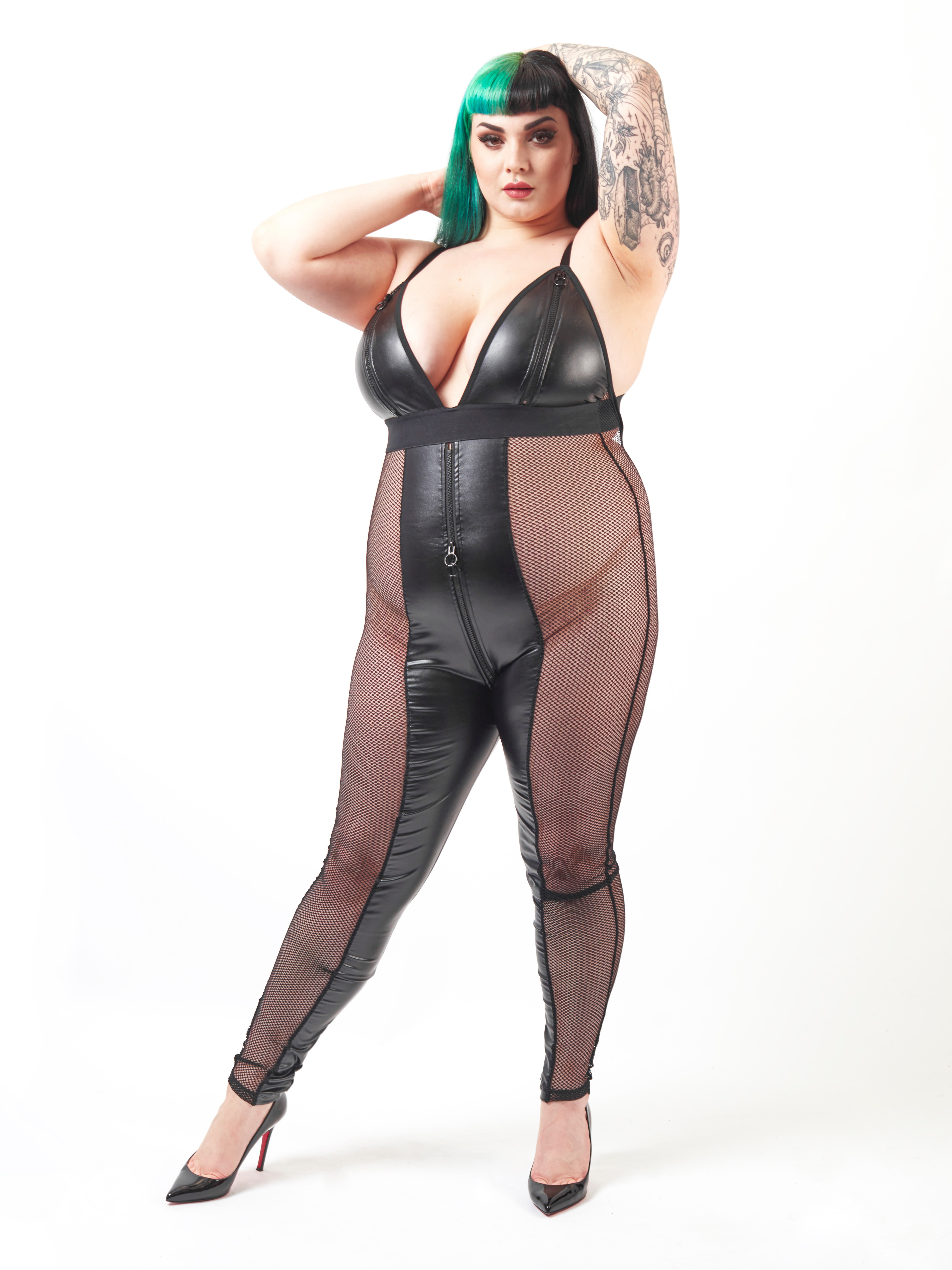 - Wet look and fishnet catsuit with front-to-back zip for a sizzling bedroom look