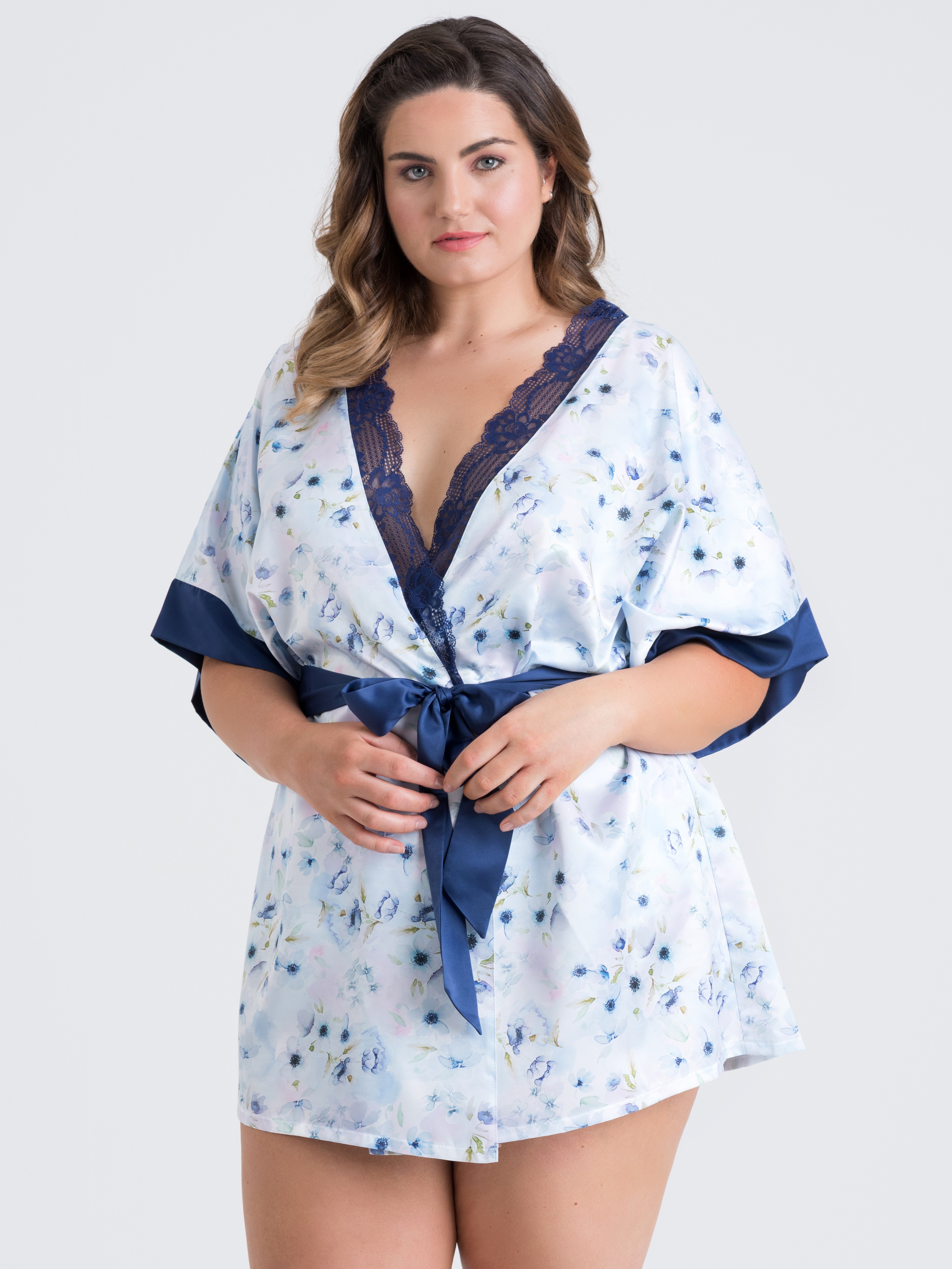 Lovehoney Plus Size Watercolour Blue Lace and Floral Satin Robe