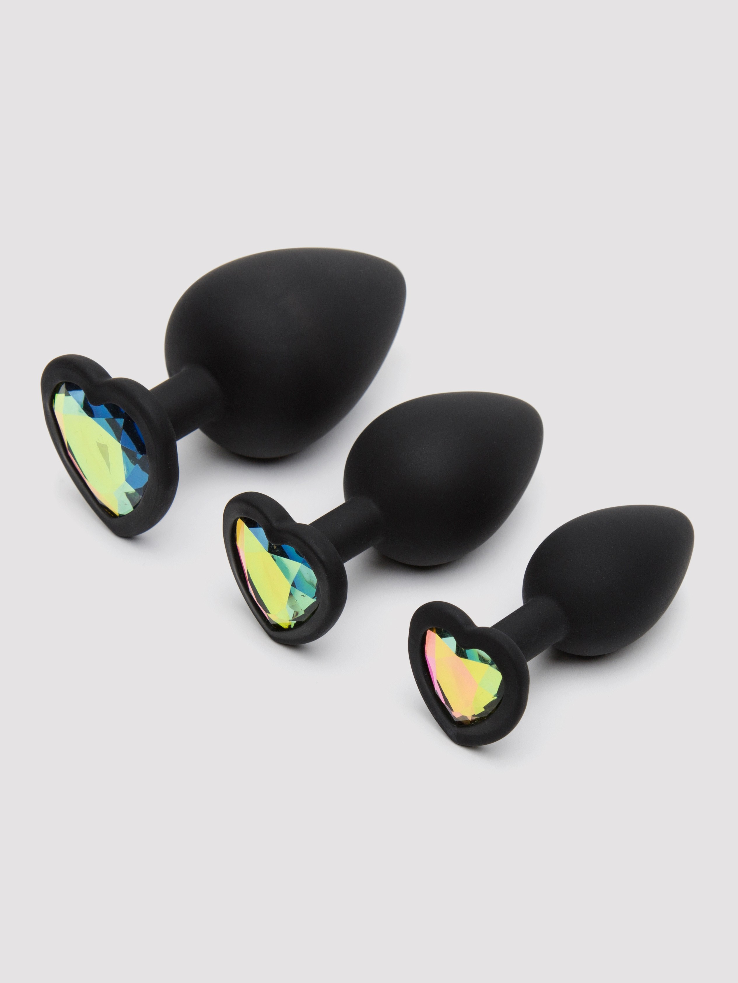 - A trio of sensual butt plugs in soft silicone, featuring bedazzling heart-shaped multicoloured crystal bases